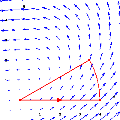 \displaystyle\frac{x}{x^2+y^2}\vi +\frac{y}{x^2+y^2}\vj\text{,}\) which is shown in Figure 13.8.7, path-independent? Why or why not?